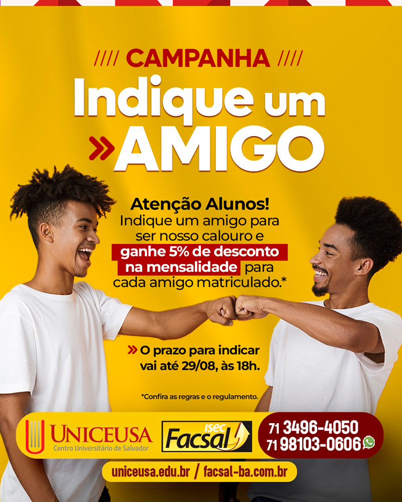 A Uniceusa – Centro Universitário de Salvador está com a campanha “Indique um Amigo”, que garante vantagens exclusivas para nossos estudantes.
